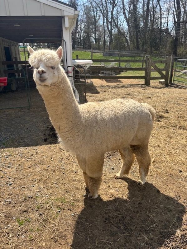Fernando was born on a hot August day to Chiquitita. What a sight to behold, this little guy. So bright white and full of beautiful crimpy fleece. His EPDs are in the Top 10%!! He’s a friendly alpaca, always the first to greet you in the male field. He is not the alpha but he seems to get along with everyone. We’re excited to see how he’ll do in the show ring and move on to stud row.