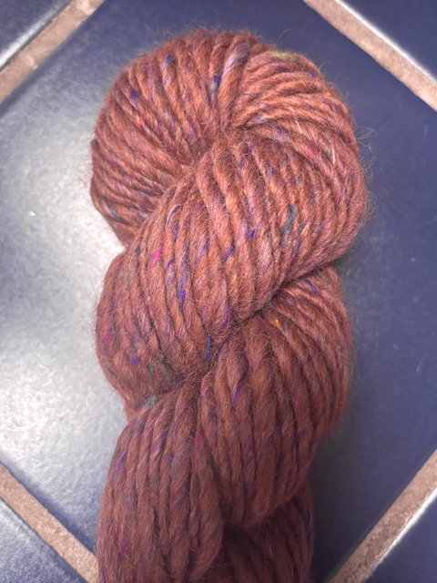 I’m in love with Lopi yarn! It’s just so beautiful and shiny and heavy and soft and full of character. This blend is from many of our alpacas – all have moved on to other loving farms. Carmenere, Moon Pie & Crystal Blue Persuasion. The Merino brings memory and the Sari Silk makes it pop. It’s a medium brown base with small flecks of purple, blue and yellow sari silk. Stunning!!